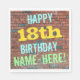This fun birthday-themed paper napkin design features a message like "HAPPY 18th BIRTHDAY, NAME-HERE!", where the name can be personalised. The background features a representation of a brick wall consisting of some reddish-brown coloured bricks. The customisable message text features colours like blue, yellow, and green, and it has an appearance inspired by that of painted graffiti. Napkins like these could perhaps be used at a birthday party for somebody who is celebrating their eighteenth birthday. [~Z0000271]