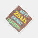 This fun birthday-themed paper napkin design features a message like "HAPPY 25th BIRTHDAY, FIRSTNAME!", where the name can be personalised. The background features a representation of a brick wall consisting of some reddish-brown coloured bricks. The customisable message text features colours like blue, yellow, and green, and it has an appearance inspired by that of painted graffiti. Napkins like these could perhaps be used at a birthday party for somebody who is celebrating their twenty fifth birthday. [~Z0000271]
