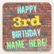 This fun birthday-themed coaster design features a message like "HAPPY 3rd BIRTHDAY, NAME-HERE!", where the name can be personalised. The background features a representation of a brick wall consisting of some reddish-brown coloured bricks. The customisable message text features colours like blue, yellow, and green, and it has an appearance inspired by that of painted graffiti. Coasters like these might be useful as practical decorations at a birthday party for somebody who is celebrating their third birthday. [~Z0000288]