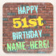 This fun birthday-themed coaster design features a message like "HAPPY 51st BIRTHDAY, NAME-HERE!", where the name can be personalised. The background features a representation of a brick wall consisting of some reddish-brown coloured bricks. The customisable message text features colours like blue, yellow, and green, and it has an appearance inspired by that of painted graffiti. Coasters like these might be useful as practical decorations at a birthday party for somebody who is celebrating their fifty first birthday. [~Z0000288]