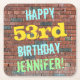 This fun birthday-themed coaster design features a message like "HAPPY 53rd BIRTHDAY, JENNIFER!", where the name can be personalised. The background features a representation of a brick wall consisting of some reddish-brown coloured bricks. The customisable message text features colours like blue, yellow, and green, and it has an appearance inspired by that of painted graffiti. Coasters like these might be useful as practical decorations at a birthday party for somebody who is celebrating their fifty third birthday. [~Z0000288]