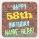 This fun birthday-themed coaster design features a message like "HAPPY 58th BIRTHDAY, NAME-HERE!", where the name can be personalised. The background features a representation of a brick wall consisting of some reddish-brown coloured bricks. The customisable message text features colours like blue, yellow, and green, and it has an appearance inspired by that of painted graffiti. Coasters like these might be useful as practical decorations at a birthday party for somebody who is celebrating their fifty eighth birthday. [~Z0000288]