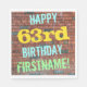 This fun birthday-themed paper napkin design features a message like "HAPPY 63rd BIRTHDAY, FIRSTNAME!", where the name can be personalised. The background features a representation of a brick wall consisting of some reddish-brown coloured bricks. The customisable message text features colours like blue, yellow, and green, and it has an appearance inspired by that of painted graffiti. Napkins like these could perhaps be used at a birthday party for somebody who is celebrating their sixty third birthday. [~Z0000271]