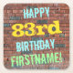 This fun birthday-themed coaster design features a message like "HAPPY 83rd BIRTHDAY, FIRSTNAME!", where the name can be personalised. The background features a representation of a brick wall consisting of some reddish-brown coloured bricks. The customisable message text features colours like blue, yellow, and green, and it has an appearance inspired by that of painted graffiti. Coasters like these might be useful as practical decorations at a birthday party for somebody who is celebrating their eighty third birthday. [~Z0000288]
