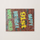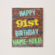 This fun birthday-themed puzzle design features a message like "HAPPY 91st BIRTHDAY, NAME-HERE!", where the name can be personalised. The background features a representation of a brick wall consisting of some reddish-brown coloured bricks. The customisable message text features colours like blue, yellow, and green, and it has an appearance inspired by that of painted graffiti. A puzzle like this might be used as a fun way to send birthday wishes to somebody who is celebrating their ninety first birthday, and who perhaps really likes doing puzzles. [~Z0000285]