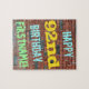 This fun birthday-themed puzzle design features a message like "HAPPY 92nd BIRTHDAY, FIRSTNAME!", where the name can be personalised. The background features a representation of a brick wall consisting of some reddish-brown coloured bricks. The customisable message text features colours like blue, yellow, and green, and it has an appearance inspired by that of painted graffiti. A puzzle like this might be used as a fun way to send birthday wishes to somebody who is celebrating their ninety second birthday, and who perhaps really likes doing puzzles. [~Z0000285]