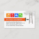 Overleaf, we have a roller brush and ladder design. The paint striped layer from the brush has your prestigious name. This is followed by the business name, its contact details and a slogan caption which you can change. Towards the top is a colourful handyman tools icon logo you can use. The tools can represent some of the services that you might offer e.g. the drill-measuring tape can represent home repairs, carpentry etc. Each tool usage is left to your own understanding.