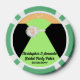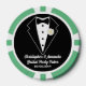 Fun bridal party poker chips with a black tie tuxedo on one side and a sage green bridesmaid gown on the other. Personalise with the bride and groom's names for a wedding party poker game. Personalised playing cards and chips also make a fun bridal party gift.