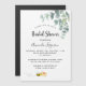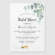 An invitation for a bride to bee. A chic white background. Decorated with white eucalyptus greenery, leaves and sprigs, and a cute happy smiling bee carrying an envelope. Personalise and add a name and party details. Black letters. The text: Bridal Shower and the name of the bride to bee are written with a modern hand lettered style script.