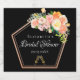 A trendy and elegant wine bottle tag for a bridal shower. Decorated with a simple copper coloured hexagon geometric frame. With a bouquet of roses in white, blush pink and coral With some green foliage. Elegant black background. Templates for the bride's name and a date. With the text: Bridal Shower written with a hand lettered style script. Green coloured letters. With two golden sparkling wine glasses as decor.