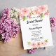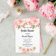 An elegant invitation card for a bridal shower. With contemporary pink, peach and coral coloured watercolored dahlia flowers as decoration. Chic white background on front. The name is written with black hand lettered style script. Back: Green coloured background.