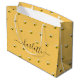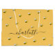 Decorated with happy, smiling yellow and black bumble bees. A yellow background. Personalise and add a name. The name is written with a large modern hand lettered style script with swashes. To keep the swashes only delete the sample name, leave the spaces or emoji's in front and after the name.