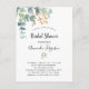 A chic white background. Decorated with green eucalyptus leaves, sprigs, greenery and a faux gold sprig. Personalise and the name of the bride to be and party details. Black letters.