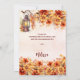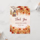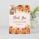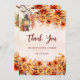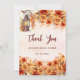 A thank you card for a Bridal Shower. A rose gold, blush pink gradient background. Decorated with a vintage lantern and orange fall tree leaves. On front large hand lettered script and the text: Thank You, your text, title and a date.