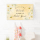 A yellow and golden honeycomb pattern as background. Decorated with cream, light yellow coloured tropical flowers, florals and happy smiling bumble bees. With the text: Welcome. Personalise and add the name of the bride to bee. The text: Bride to Bee and Bridal Shower is written with a modern hand lettered style script. Perfect as party wall decoration or as a welcome sign.