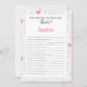 This bridal shower game features a beautiful faded red and white hearts border that adds a touch of elegance to the design. The border design is also the full back of the bridal shower game, making it super pretty from all angles. The bride-to-be's name is listed in a pretty faded red under the question "How Well Do You Know The Bride?", adding a personal touch to the game.