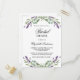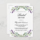 A white background. Decorated with violet lavender flowers and eucalyptus greenery. Personalise and add a name and party details. The name is written with a hand lettered style script