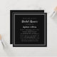 Simple and chic black and white bridal shower square invitation design features a simple contemporary minimalist design with a double frame border in white on a classic black background. Personalise bridal wedding shower design with your details in trendy lettering and script in white. The back matches in solid black. For best results replace template details with your own details leaving space between paragraphs as in the example and use all lower case letters where specified. E-mail invitationsuites@gmail.com with questions or custom requests.
