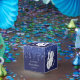 A navy blue background colour. Decorated with blue glitter drips, paint dripping look and white balloons. Personalise and add a name, and date. Modern hand lettered style script. With the text: Bridal Shower and Thank You written with a modern hand lettered style script.