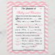 Looking for a funny bridal shower or wedding lib game? Stop the search! This game is what you have been looking for! Featuring The Romance of The Bride and Groom as the featured topic, your guests can fill in the blanks to create a one of a kind romance story about the bride and groom. This is a fun and often funny bridal shower game! The design is featured on a pink and white chevron zigzag background to make a modern bridal shower or wedding party game. Copyright henishouseofpaper
