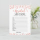 Purchase this game and enjoy high quality Bridal word scramble card for your event! Unscramble the wedding words! Rose Gold confetti design. ANSWERS: 1-GIFTS, 2-RING, 3-BRIDE, 4-WEDDING, 5-GUESTS, 6-CAKE, 7-GROOM, 8-BRIDESMAID, 9-DRESS, 10-CHAPEL, 11-USHERS, 12-MARRIAGE, 13-HONEYMOON, 14-VOWS, 15-BEST MAN