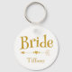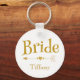 This lovely key chain can be kept as a reminder of your special day. Featuring a white background with a gold font "Bride" is written in fun large letters. Underneath "Bride" is a heart arrow. Directly under the heart arrow is a template for writing your name. Place your order today!