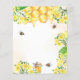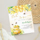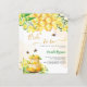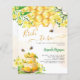 A stylish white and golden watercolored background. Decorated with bumble bees, melting honey and honeycomb with yellow florals, flowers and a wedding cake with lemons. With the text: Bride to bee written with a modern hand lettered style script. Personalise and add the name of the bride to bee.