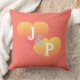 Bright coral background with turquoise white script. Sunset shades of golden yellow to pink hearts reversible Wedding Throw Pillow. Personalise hearts with couple's monogrammed initials. Back of pillow personalise with Bride and Groom's First Names and Wedding Date. Lovely wedding gift for the newlyweds! Original Graphic Artwork design by TamiraZDesigns.