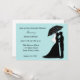 A stylish couples shower invitation with bride and groom silhouette on blue background. Bride is holding a floral umbrella.