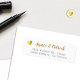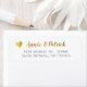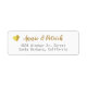 Your home address personalised in a easy way... in a white, clear and clean label with two lines of text aligned by centre, and bride and groom names written in a stylish script font style with the image of a small faux gold heart