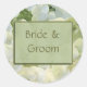 Easily change names to bride and groom's name and use these fun stickers for bridal showers, gift tags, envelope seals, napkin stickers and more. White hydrangea flower background with sage green pin stripe accent.