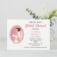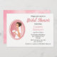 A bridal shower invitation with an illustration of a smiling bride holding a bouquet of flowers in her fancy wedding dress and wearing a veil. Set inside a pink oval frame with a scalloped border.