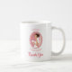 Bridal shower thank you mug with an illustration of a smiling bride holding a bouquet of flowers in her fancy white wedding dress and wearing a veil. Set inside a pink oval frame with a scalloped border.