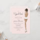 Lingerie bridal shower invitation features the bride to be in her underwear and looking to be spoiled. Back of invitation features lace background and lingerie with the bride’s sizes.
