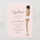 Lingerie bridal shower invitation features the bride to be in her underwear and looking to be spoiled. Back of invitation features lace background and lingerie with the bride’s sizes.
