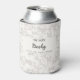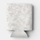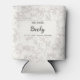 A personalised can cooler with the title, names, date and/or location of your wedding celebration. Here is the almost white version: white background, light grey floral pattern, and the most important information in darker lettering on an almost white background.