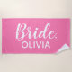 Bride Pink And White Newlywed Bride Beach Towel. Modern script wifey beach towel. Perfect honeymoon towel for the bride. Personalise this custom design with your own name or text.