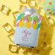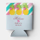 Bride to be Pineapples can cooler is a tropical koozie for your bridal celebration. The front top half features pink blue and green diagonal stripes with three yellow pineapples. The and the bottom half displays blue background. The bride's information is in customisable pink font with a pink flower separating her name from her wedding date. Place your order today!