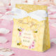 A favour box for a summer Bridal Shower. A yellow background with a honeycomb pattern. With a faux gold geometric frame and faux gold glitter drips. Decorated with pink tropical florals flowers, hibiscus and happy bumble bees. With the text: Thank You and Bride to Bee written with a modern hand lettered style script. Template for the bride to be's name and the date of the shower. Pink, green and brown letters.