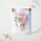 Adorable wedding invitation R.S.V.P. with a beautiful bride in white lace, holding a fresh flower bouquet with pink roses in the background.