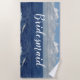 Bridesmaid beach theme.  Bridesmaid is written in white script. Background has pretty blue ocean with white foam waves and light blue sky with big fluffy white clouds.  Fun keepsake beach towels for the wedding party.  Original Photography Design © TamiraZDesigns.