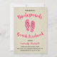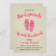 A cute bridesmaids party invite for a weekend at the beach, with pretty pink watercolor calligraphy, pink faux glitter sandals, and a beachy, light brown wood grain background.
