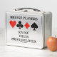 Any avid bridge player will enjoy this metal lunch box featuring the four card suits along with the following bridge saying: "Bridge Players Know Their Probabilities". Memorable truism bridge saying metal lunch box for any bridge teacher or bridge director!
