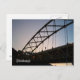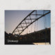 A silhouette of one of Pittsburgh's many bridges; the sun setting behind it, making the sky a purple blue colour. The city's name can be found in the lower left corner in a white font. The photo was taken on the Monongahela River on during a summer evening.