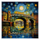 A.I .created print of a vibrant surreal night scene depicts a brightly lit bridge with colorful buildings reflected on a river, beneath a moonlit, starry sky.