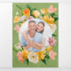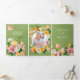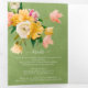 Bright and Bold floral botanical arrangement with colours of yellow, peach, pinks, and white against a Apple Green mottled background Wedding all in one Tri-fold invitations that come with response cards RSVP, Details and info and a photo of the couple. Wonderful for a spring, summer, or garden wedding!