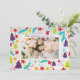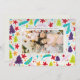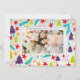 A cheery and non-traditional take on classic Christmas motifs, this holiday photo card features a frame border of bright, illustrated, wintery elements like trees, poinsettia flowers, pine branches, stars, and snowy swirls in purple, aqua, lime green orange and red. Personalise the modern, simple text on the front with a greeting of your own and a longer message of holiday cheer on the back.