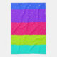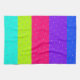 A tea towel with a mix of bright blue, mauve, pink, green and teal stripe pattern, with polka-dots, all colours can be personalised to any colour to coordinate with your kitchen decor, and text can be added to customise for yourself or a gift. White stripes are removable if you prefer.
