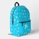 Show off your love of skiing and ski jumps with this personalised backpack. It features illustrations of skiers doing ski tricks as well as snowflakes in white set against a bright blue background. There's a spot on the front pocket to add your initials or other text.