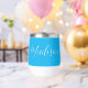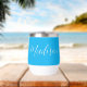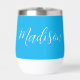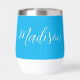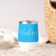 A bright blue personalised monogram wine tumbler for a girl or guy who loves trendy, handwritten gifts. Beautiful cursive script spelling out your name in modern typography.